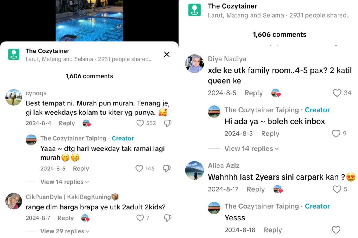 Tangkap layar di ruangan komen TikTok The Cozytainer Taiping.