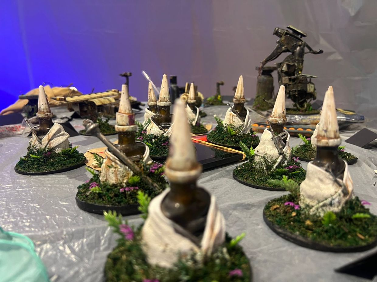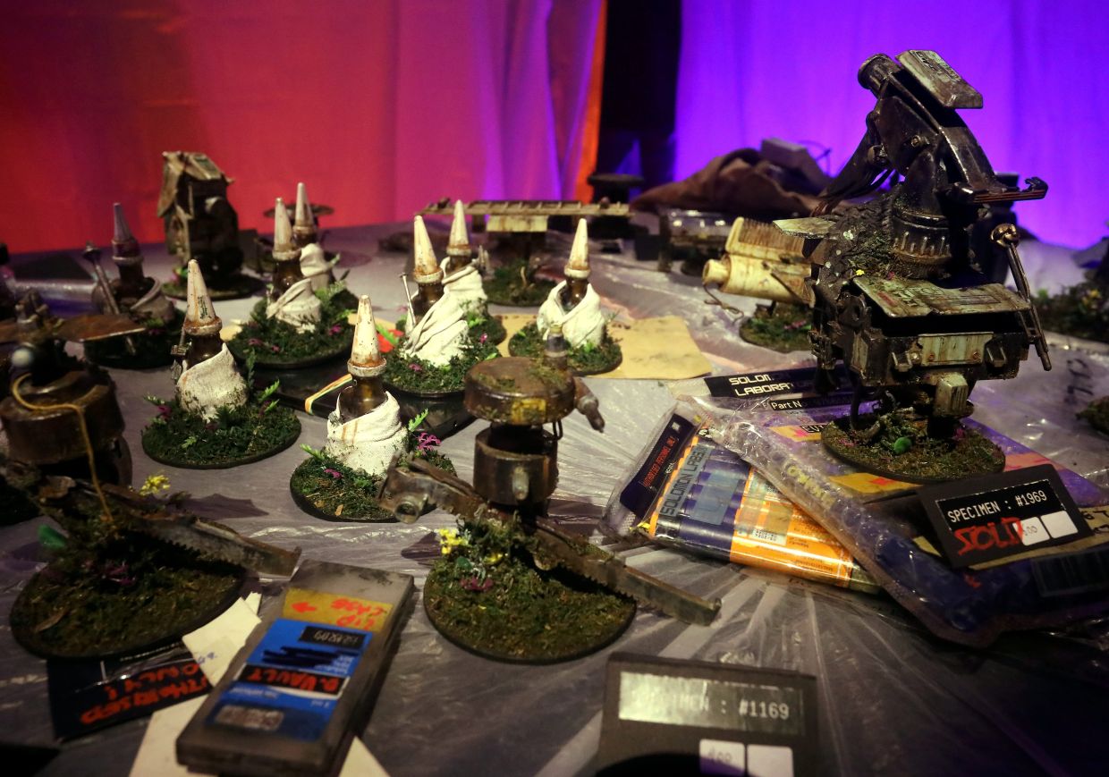 Koleksi yang memperlihatkan seperti sepasukan tentera (menurut penulis) dan penutup putih gam digunakan sebagai topi.