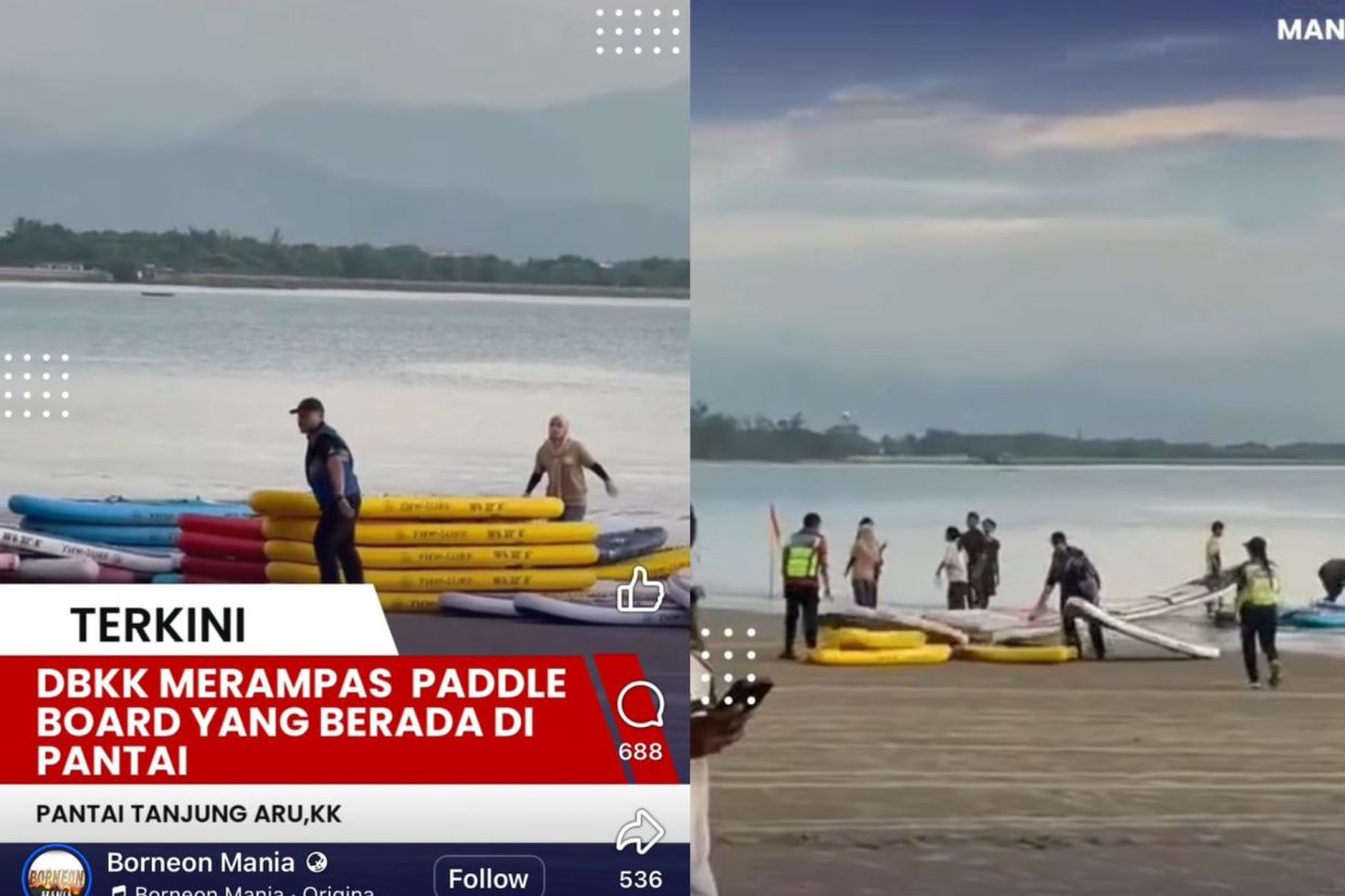 Menerusi hantar video di Facebook Borneon Mania, tular situasi di pantai Tanjung Aru, Kota Kinabalu, yang memaparkan Dewan Bandaraya Kota Kinabalu yang sedang merampas paddle board di sekitar kawasan pantai tersebut.
