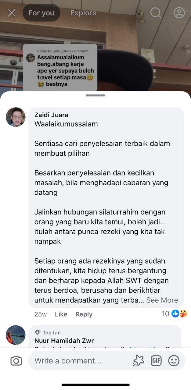“Sentiasa cari penyelesaian terbaik dalam membuat pilihan. Besarkan penyelesaian dan kecilkan masalah, bila menghadapi cabaran yang datang. Jalinkan hubungan silaturahim dengan orang yang baru kita temui, boleh jadi itulah antara punca rezeki yang kita tak nampak.