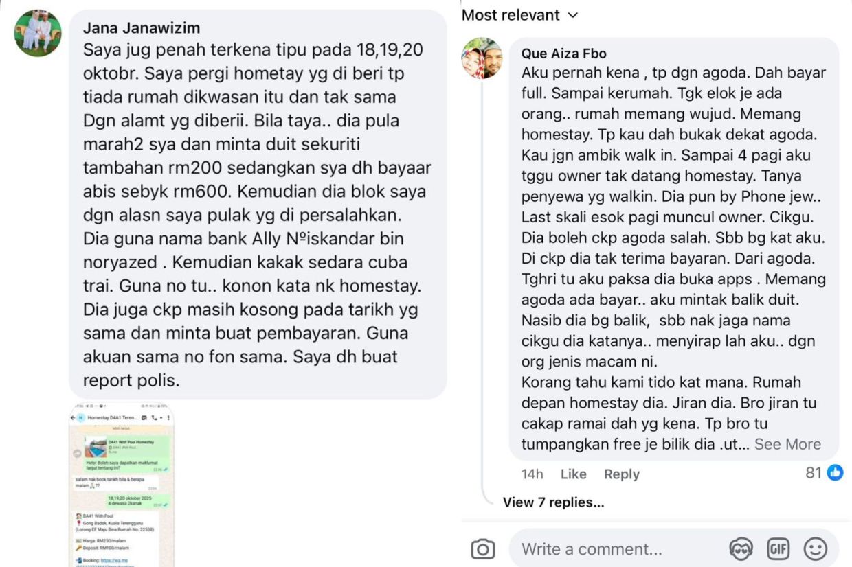 “Saya juga pernah terkena pada tempahan 18 hingga 20 Oktober. Saya pergi rumah inap yang diberi tapi tiada rumah di kawasan itu dan tak sama dengan alamat yang diberi. Bila tanya, dia pula marah-marah dan minta duit sekuriti tambahan RM200. Saya dah buat laporan polis,” komen seorang lagi mangsa.