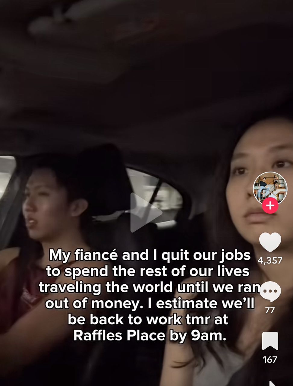 “Tunang saya dan saya berhenti kerja untuk mengembara ke seluruh dunia sepanjang hayat kami sehinggalah kami kehabisan wang. Saya anggarkan kami akan kembali bekerja esok di Raffles Place pada 9 pagi,” tambahnya.
