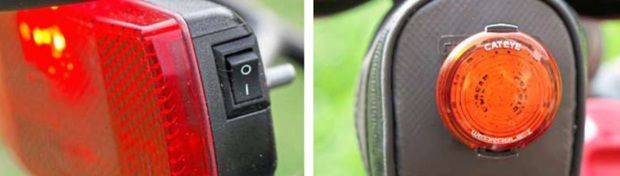 Lampu belakang yang dipasang secara kekal adalah sebahagian daripada peralatan standard basikal. Gambar kanan pula lampu berprestasi tinggi dengan tetapan berbilang mod yang boleh dipasang pada beg pelana basikal.