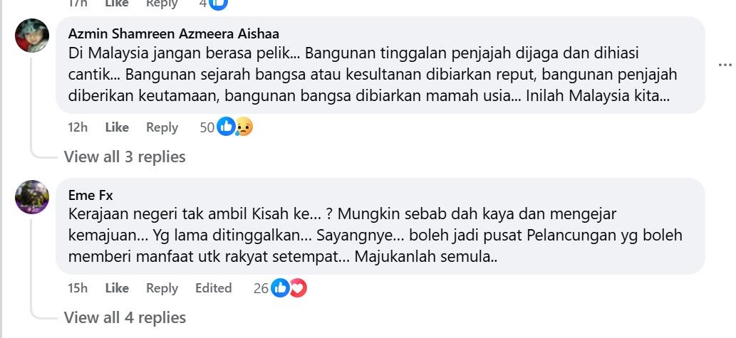 “Pihak muzium negeri sepatutnya ambil alih dan kembalikan zaman kegemilangan tersebut,” cadang seorang pengguna @Norhayati Bidin di ruangan komen.