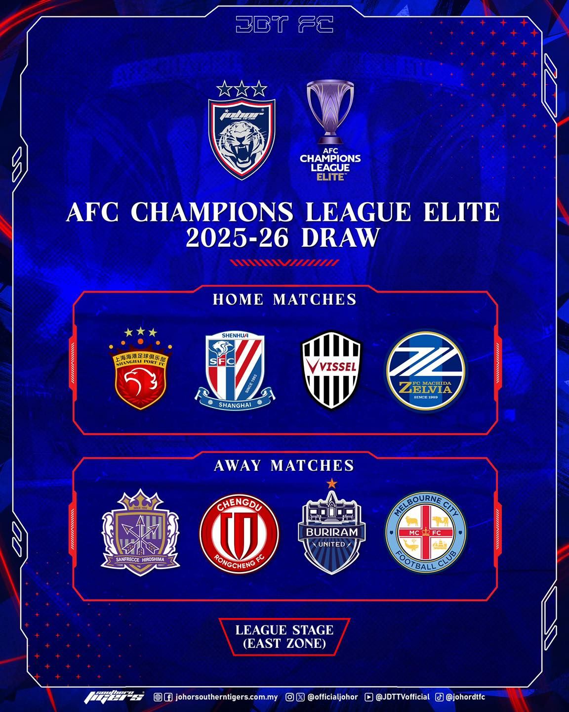 WAKIL tunggal Malaysia dalam saingan Liga Juara-Juara Asia Elit (ACLE) 2025/26, Johor Darul Ta’zim (JDT) diundi menentang beberapa gergasi Asia termasuk dua kelab China dan dua kelab Jepun dalam saingan Zon Timur yang bakal menyaksikan empat aksi berlangsung di laman sendiri.