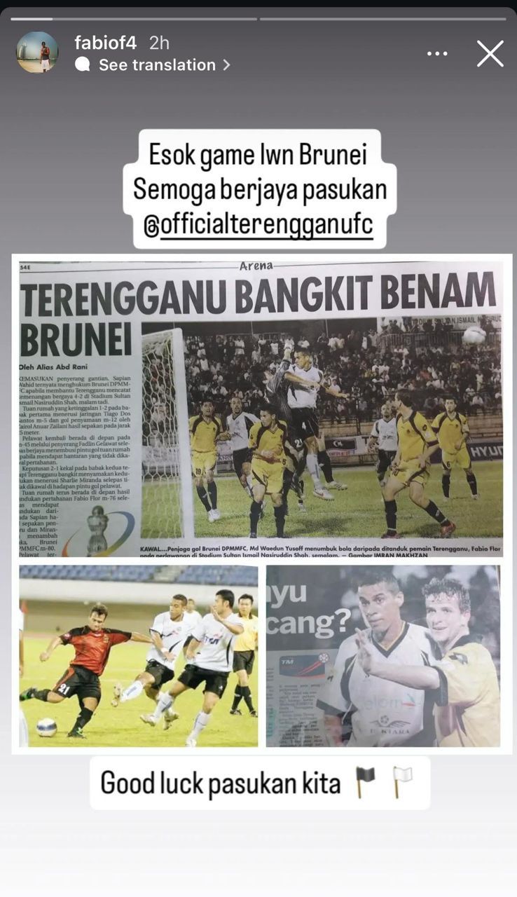 "Esok (Jumaat) perlawanan berdepan Brunei, semoga berjaya pasukan Terengganu FC. Semoga maju jaya pasukan kita," katanya menerusi hantaran di laman InstaStory peribadinya.