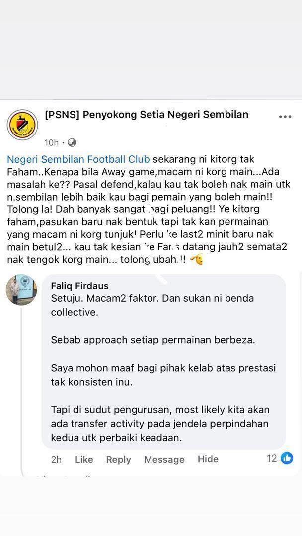 Respons Faliq terhadap luahan penyokong Negeri Sembilan mengenai prestasi buruk mereka di tempat lawan.