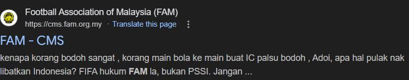 Tidak terhenti di situ, sekiranya pengguna membuat carian CMS FAM di pelayar masing-masing, mereka akan mendapati terdapat mesej berhubung isu pemain warisan terpapar.