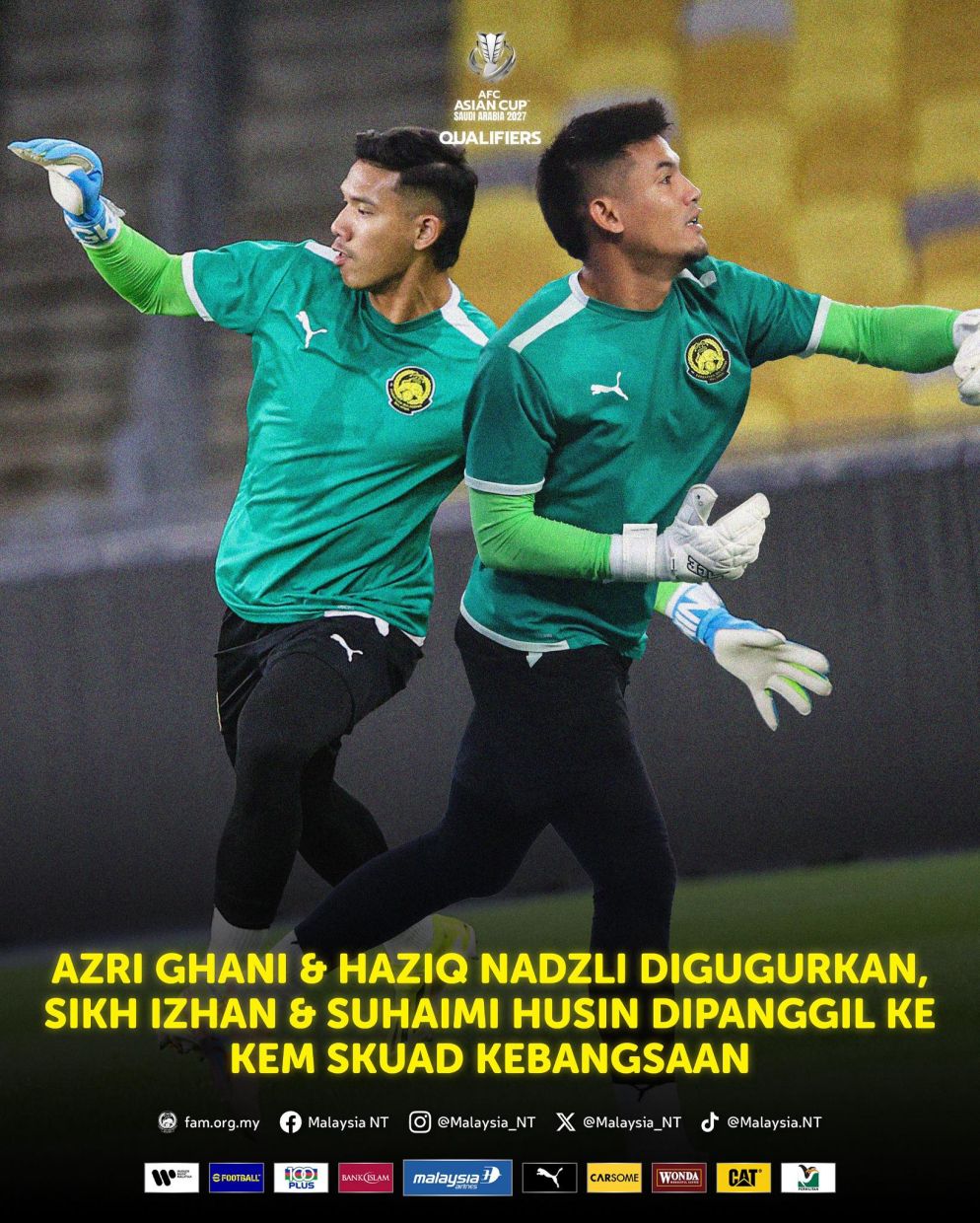 SKUAD kebangsaan terpaksa melupakan khidmat dua penjaga gol, Haziq Nadzli dan Azri Ghani yang mengalami kecederaan dan tidak boleh terlibat dalam aksi Kelayakan Piala Asia 2027 menentang Laos.