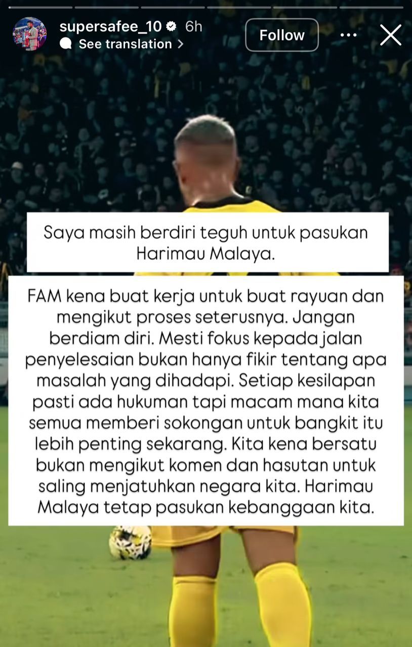 Menerusi satu hantaran di Instagram Story pada Selasa, pemain berusia 41 tahun yang pernah menjulang Piala AFF Suzuki 2010 itu menegaskan bahawa dia berdiri teguh di belakang skuad Harimau Malaya pada waktu sukar ini.