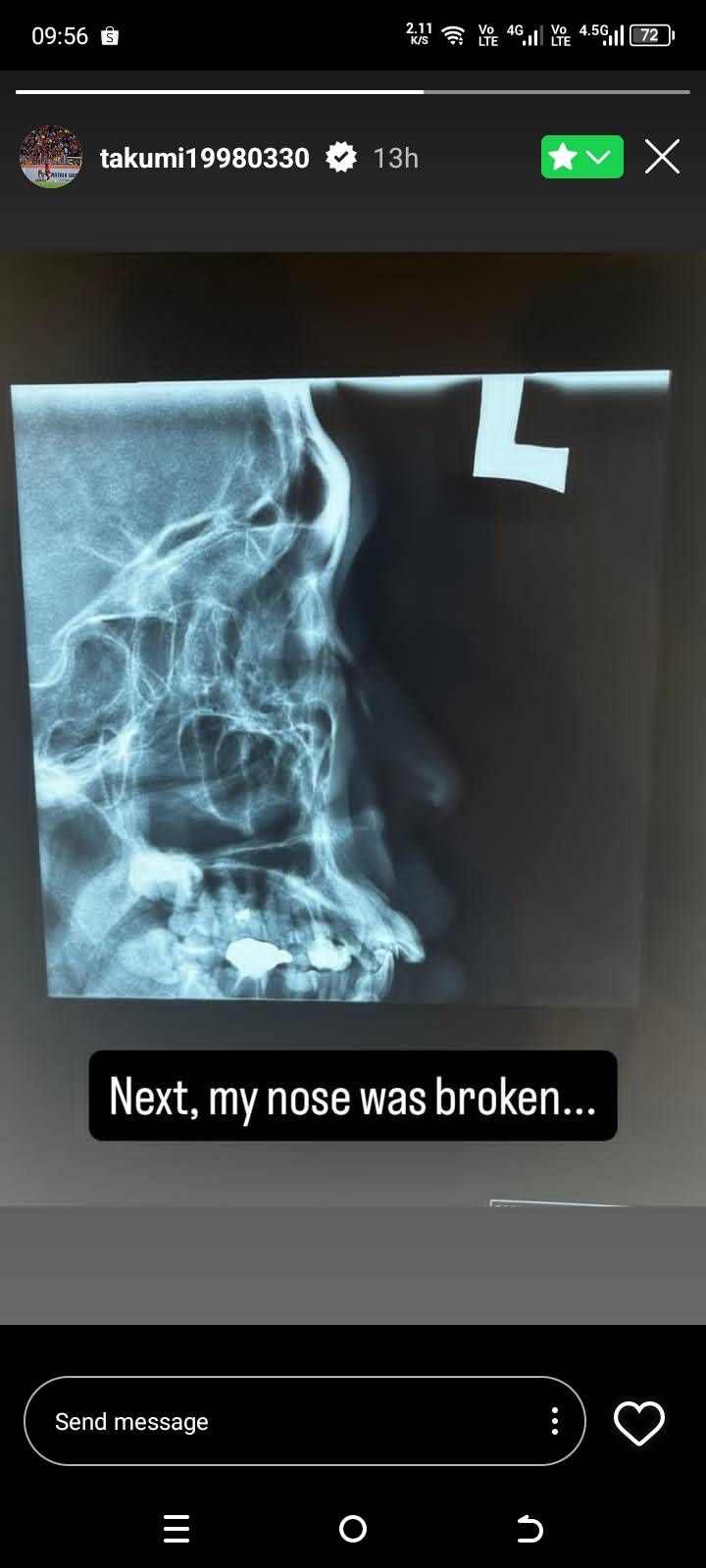 Import dari Jepun itu sebelum ini berkongsi sekeping foto memaparkan sinaran X dilakukan ke atas wajahnya berserta kapsyen ringkas 'Hidung saya patah'.
