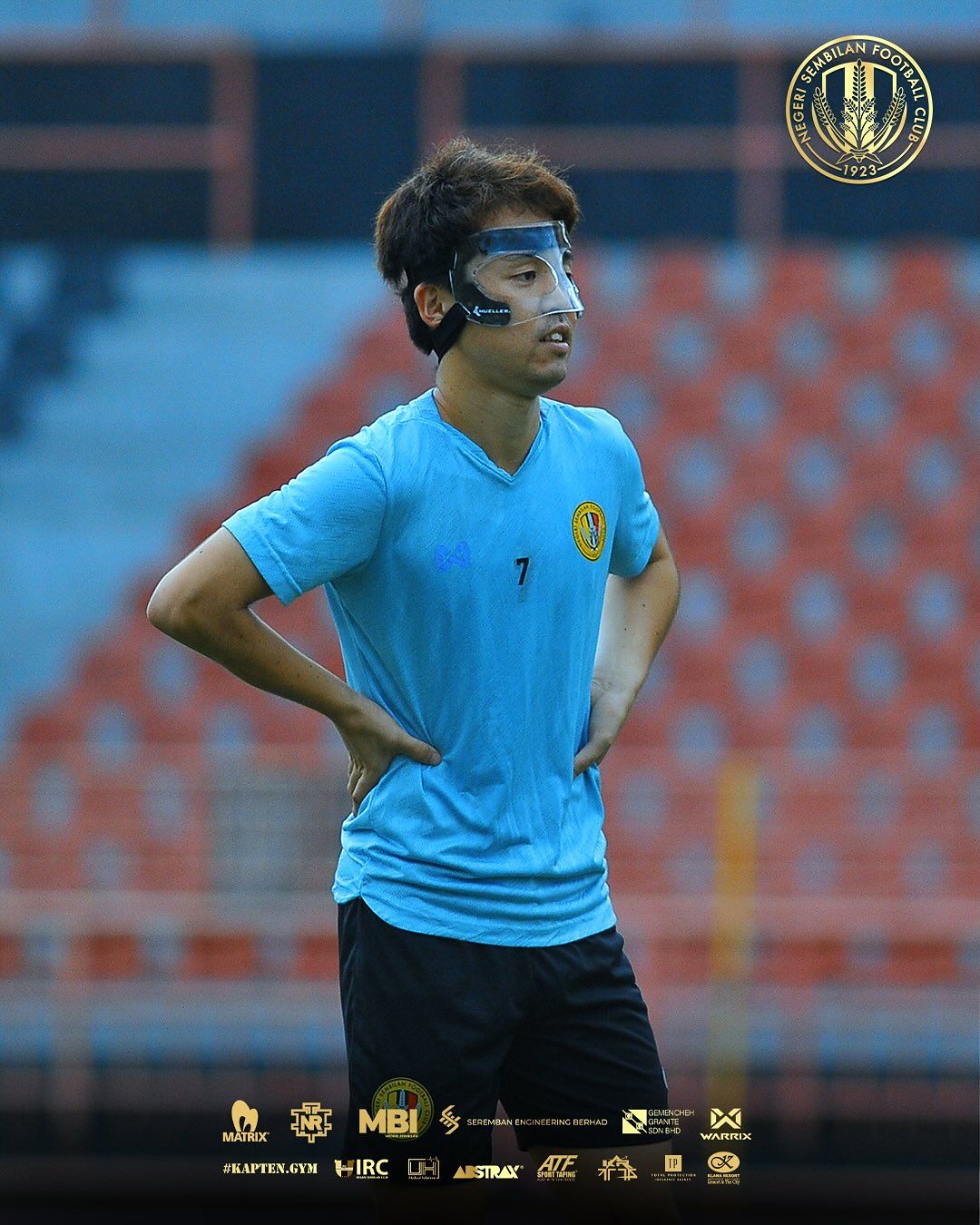 Sasaki memakai topeng perlindungan khas ketika terlibat dalam sesi latihan. — Facebook/Negeri Sembilan FC