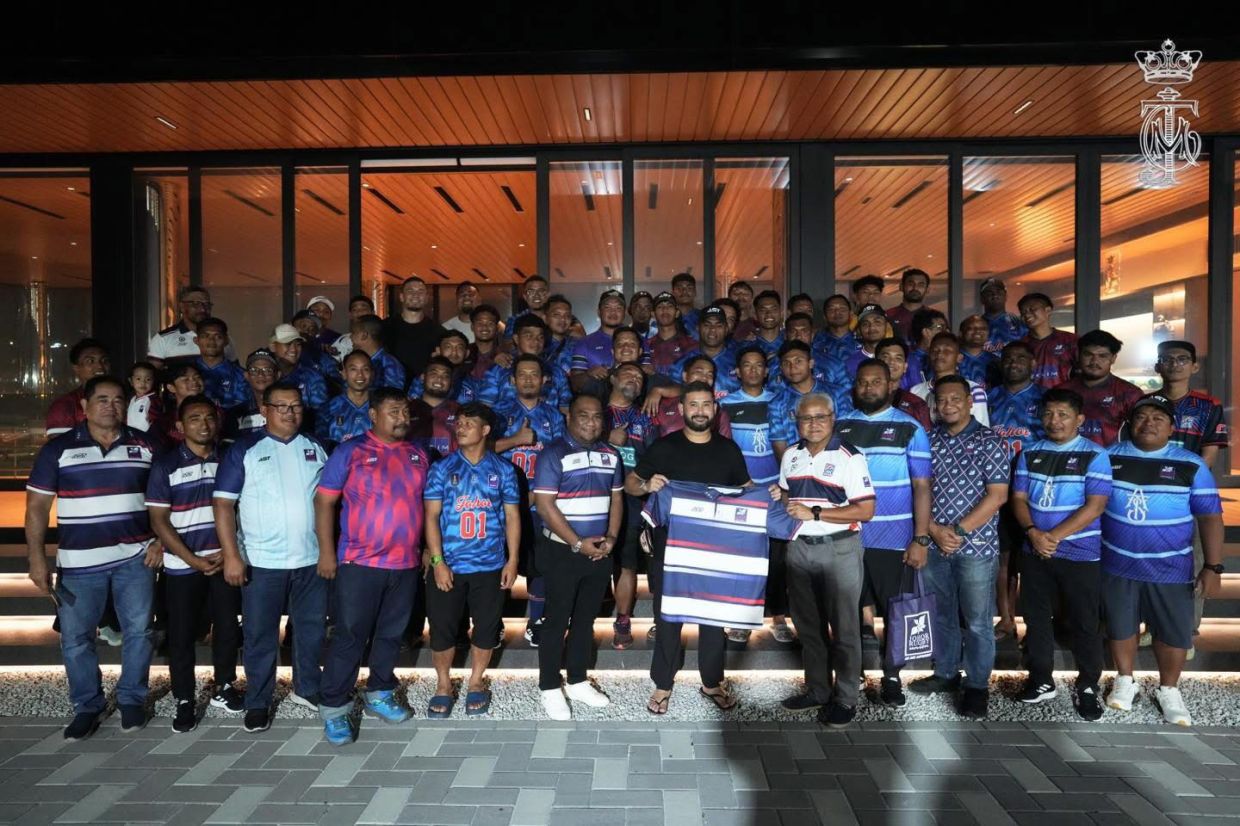 Pertemuan Tunku Ismail dan skuad ragbi Johor menjadi suntikan semangat menjelang final Piala Agong 2025. — Facebook/Tunku Ismail Idris