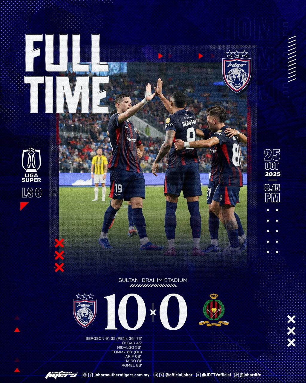 Kemenangan besar itu bukan sahaja menegaskan dominasi skuad Harimau Selatan, malah menjadi isyarat jelas bahawa standard permainan mereka kekal tinggi biarpun hanya empat hari selepas menewaskan Chengdu Rongcheng 2-0 dalam saingan Liga Juara-Juara AFC Elite (ACLE).