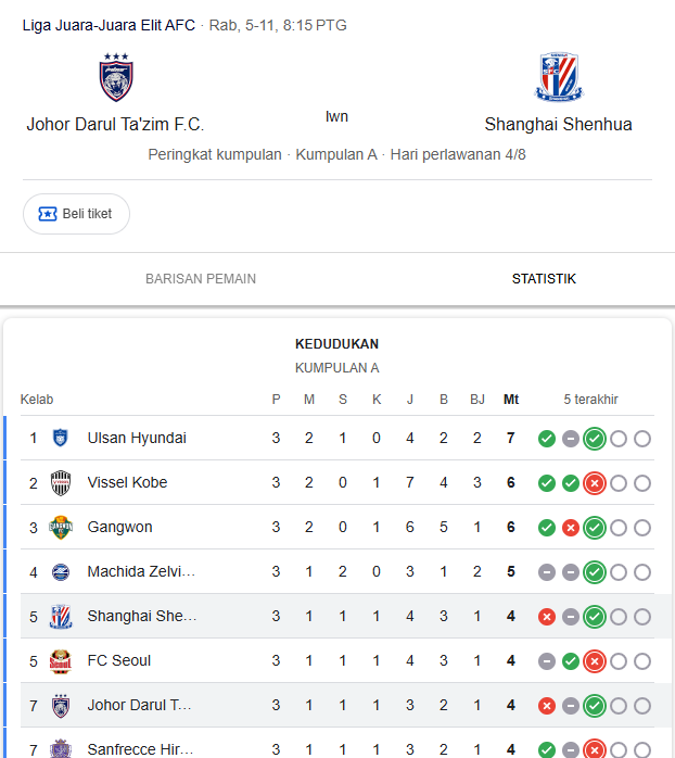 Tangkap layar jadual JDT yang bakal bertemu Shanghai Shenhua selepas ini.