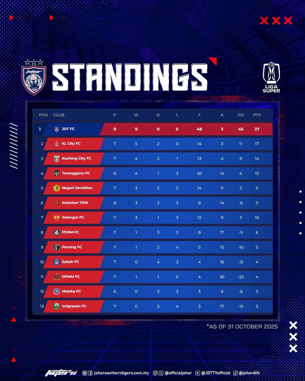 Jumlah jaringan kelab Selatan tanah air itu berada dalam prestasi terbaik dengan 48 gol sudah dicetak atau purata kira-kira lima gol setiap perlawanan.
