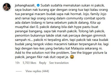 "Sudah-sudahlah memalukan sukan ni pakcik. Saya bukan nak kurang ajar dengan orang tua, tetapi kalau orang tua perangai macam budak, siapa hendak hormat? Kita naikkan muay thai dari kosong, pakcik datang apabila dah hangat dan buat perangai bangang, siapa tak marah?