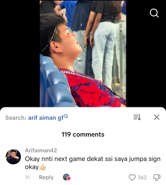 Menerusi rakaman video yang dikongsikan pengguna TikTok, @mrlabufotosense, budak lelaki berbangsa Cina itu dilihat membawa sehelai jersi dan sebiji bola sambil menunggu peluang untuk bertemu Arif Aiman selepas perlawanan tamat.