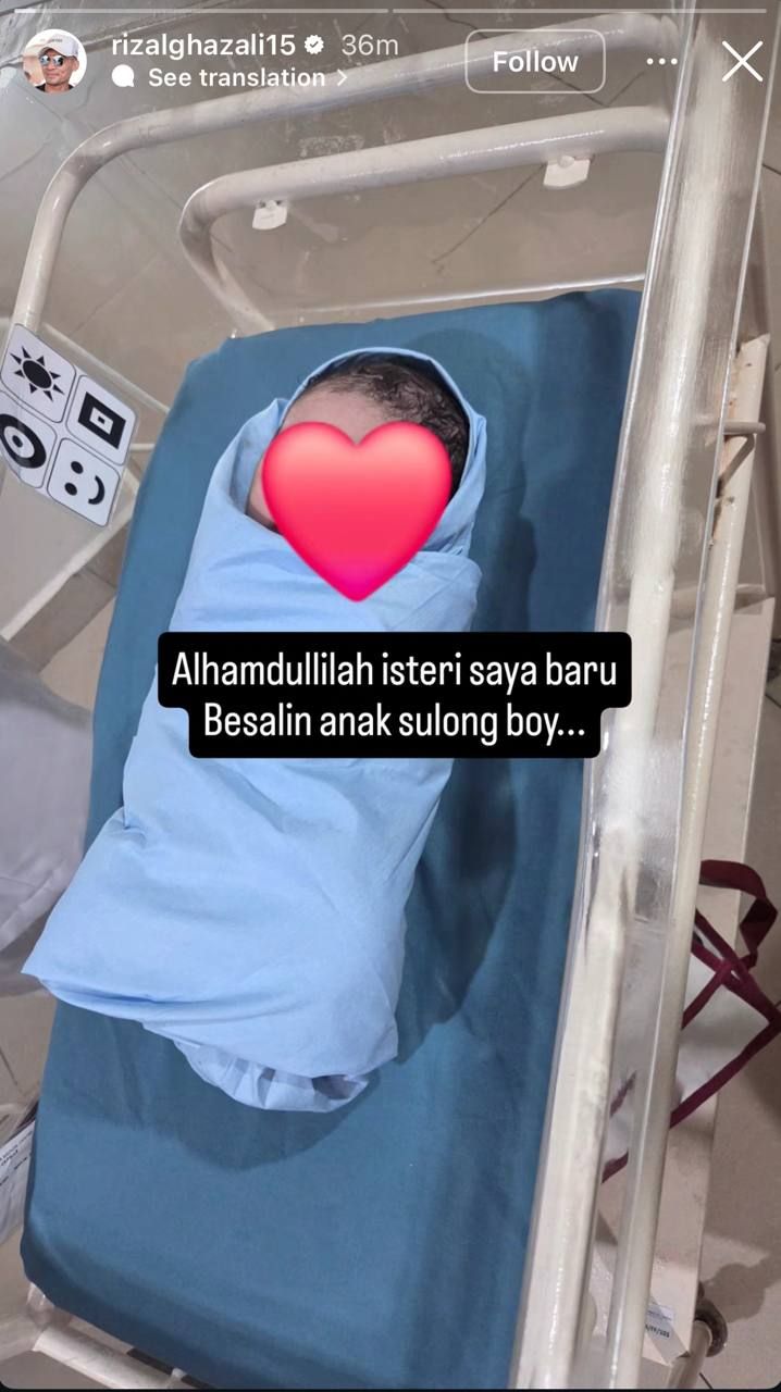 “ALHAMDULILLAH, isteri saya baru bersalin anak sulung lelaki,” kata Rizal ringkas menerusi Instagram Story (IG Story).