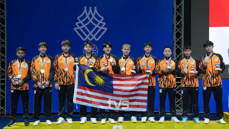 Skuad lelaki Malaysia meraih perak dalam acara badminton berpasukan di Sukan SEA 2025. — TVS