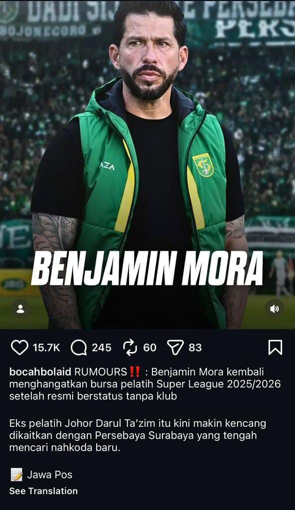 Menurut laporan tersebut, Mora kembali menghangatkan kerusi jurulatih menjelang musim Liga Super 2025/26 selepas secara rasmi berstatus tanpa kelab, sekali gus menjadikannya antara calon utama untuk mengemudi Persebaya yang sedang mencari pengendali baharu.