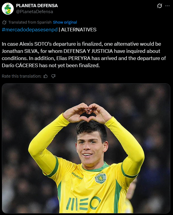 "Sekiranya pemergian Alexis Soto dimuktamadkan, salah satu alternatif ialah Jonathan Silva, yang mana Defensa y Justicia telah bertanyakan mengenai syarat-syaratnya," lapor media Argentina, Planeta Defensa menerusi laman X.