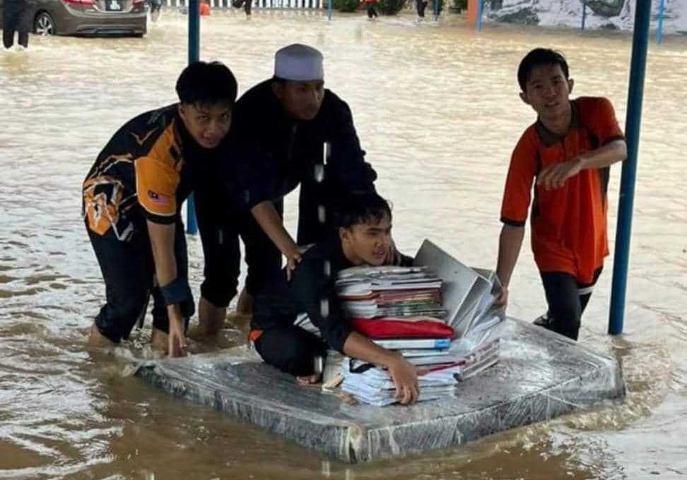 BEBERAPA pelajar dilihat berusaha dalam memastikan buku-buku mereka tidak hanyut ketika banjir